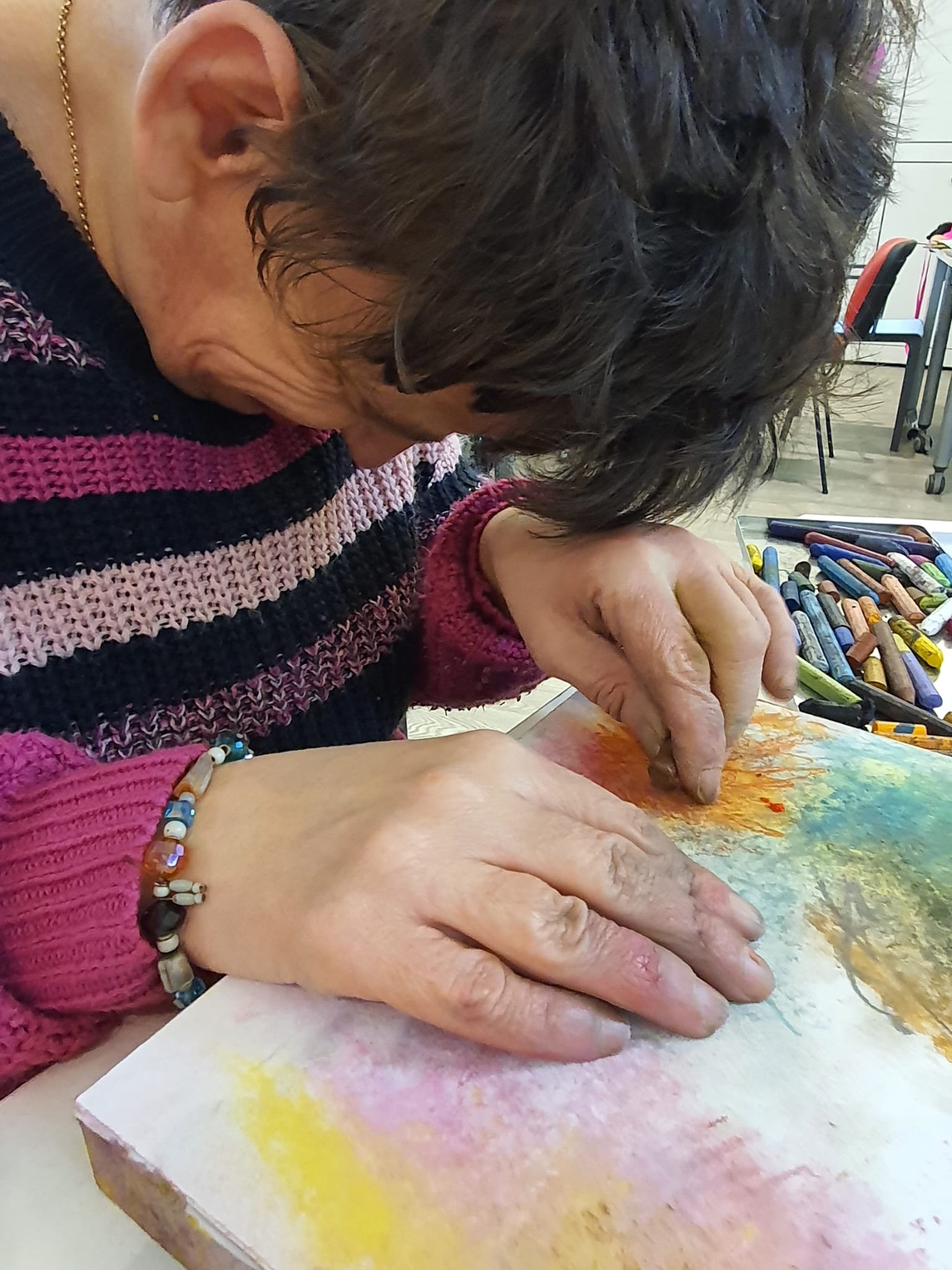 Swallow works in soft pastels, wax crayons, or thick heavy graphite sticks, applying layers of colour with both hard and softer lines. When drawing, all her senses work in tandem especially her sense of touch, often touching her face when working with the soft pastels, ending up with colour everywhere. Whilst creating, there is often little conversation, as she is focused on what she is producing. Swallow is part of The Partnership, an art studio linked to the Grundy Art Gallery in Blackpool.