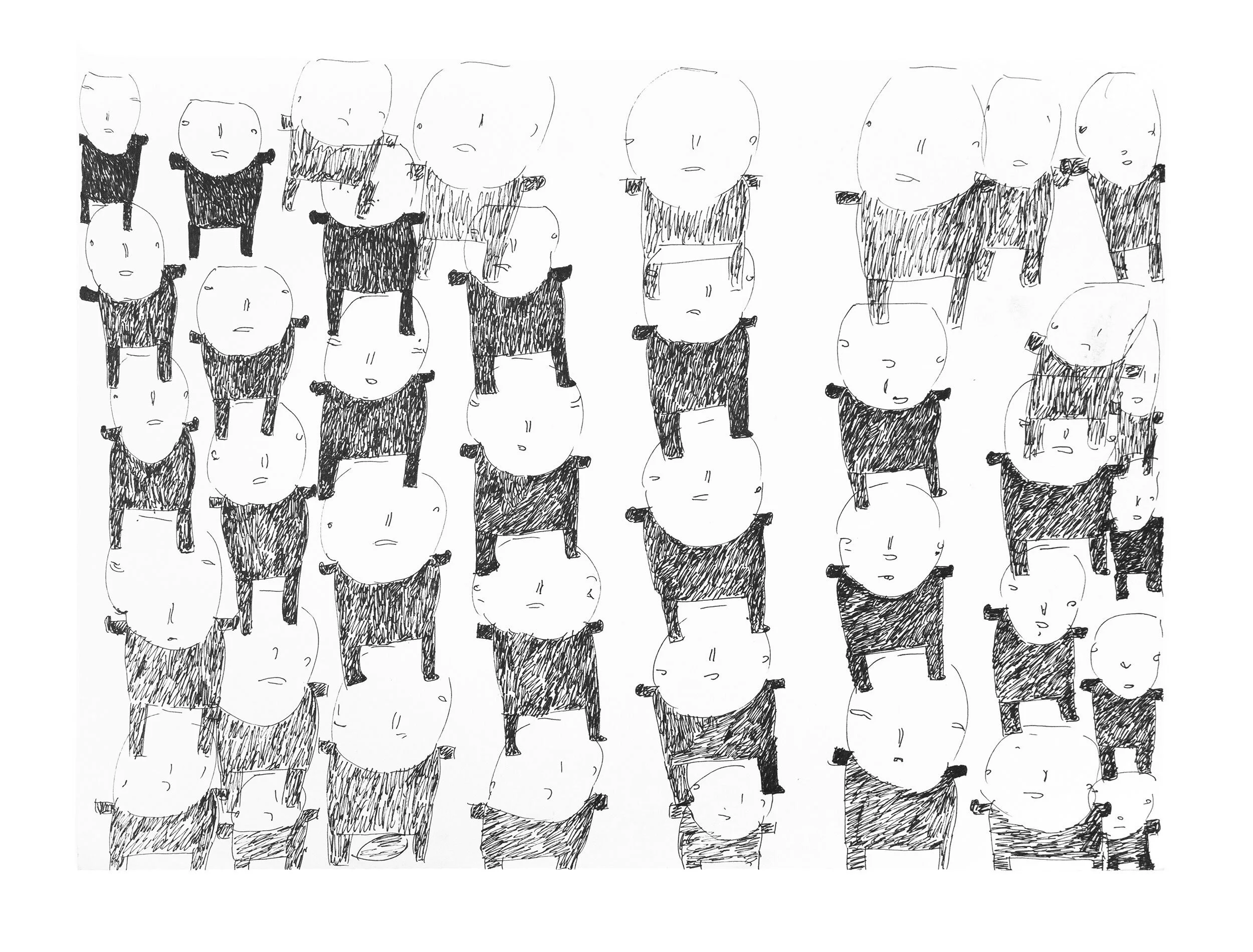 Several years ago, a change began in Mitchell’s responsiveness to his environment that heralded an accompanying change in his artwork. Beginning in small sections of each piece of art, Mitchell started to uncover the faces and forms buried in the darkness. Soon the work began to be populated by figures both in motion and in thought-filled repose. The dense compositions of scrawled lines or expressive brushstrokes create visions of the relationships between people that are both dependent and independent of each other. The forms are autonomous or overlapping, in horizontal fields or a vertical line, with imploring gazes that stare out to the viewer. He renders these anonymous people one by one until his page is covered with often dozens of totemic figures. Today his fundamental imagery remains the same – legions of crowded figures march across the now illuminated field of his vision.