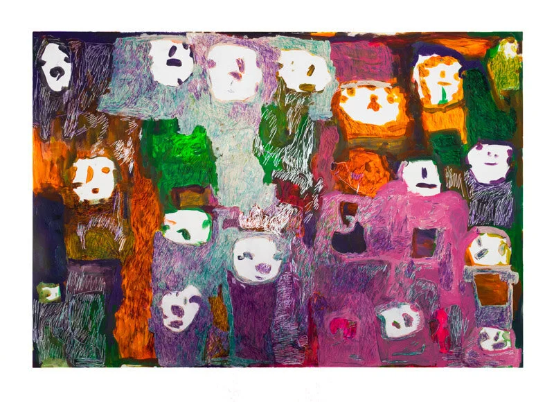 Donald Mitchell has been an artist at Creative Growth since 1986. The evolution of his work takes an interesting trajectory, wherein his recent work revisits some of his early impulses. Donald’s work began with dense abstract and cross-hatched fields of black lines or brush strokes that obliterated the paper and hid any trace of underlying image. Over time, Donald slowly uncovered the faces and forms buried in the darkness. His work then became populated by multiple figures that were autonomous or overlapping, and whose relationships became both dependent and independent of each other. Donald’s recent work maintains the foundation of these anonymous figures, but has returned to abstraction with late-career artist’s skill. Donald’s work has been exhibited internationally, and is included in major private and institutional collections.