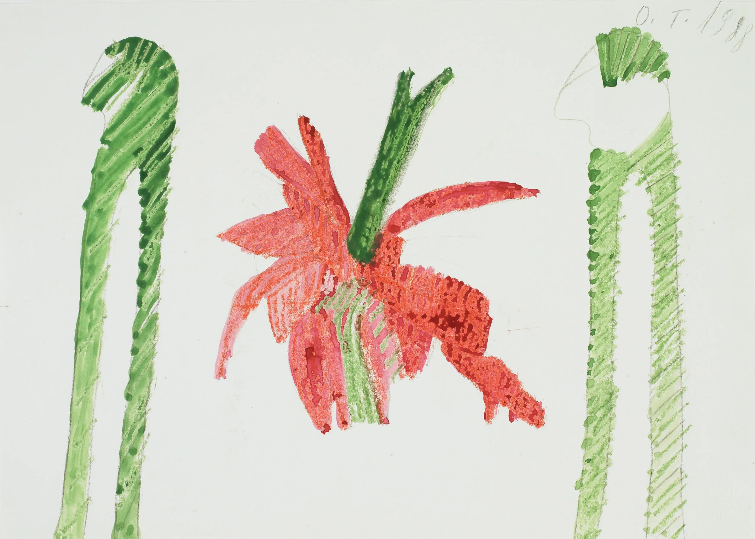 Oswald Tschirtner was born in 1920 in Perchtoldsdorf, Lower Austria, and lived in the House of Artists in Gugging from 1981 until his death in 2007. Encouraged by the psychiatrist Leo Navratil, Tschirtner started drawing in the 1960s. He became known for “his head-footer”: reduced figure without characteristic attributes such as clothing or gender. Its head flows with the body, the legs are no longer separated, but unite – quite elegantly – into a stumpy trunk with fingerless arms. The artist worked on postcard-sized paper, on canvases, or house facades, and used – depending on the dimensions – pen and Indian ink, Sharpie marker, or acrylic paint. He is regarded as a master of minimalist visual language. In 1990, he and the Gugging Artists were awarded the Oskar Kokoschka Prize. His works can be found in the Setagaya Museum, Japan, the Collection de l’Art Brut, Switzerland, and in the Museum of Modern Art Ludwig Foundation, Austria, among others.