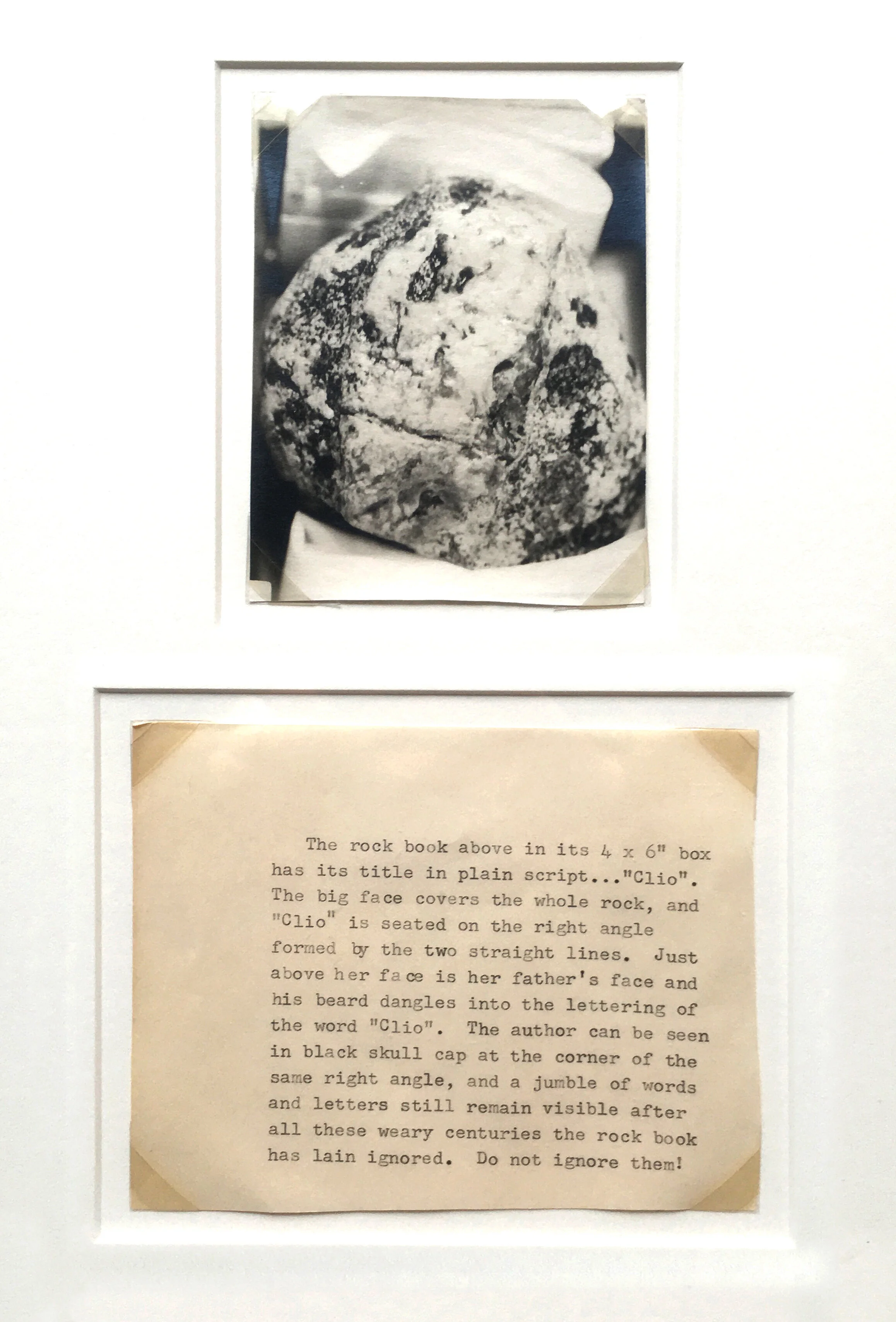 I have a few pieces by a truly "outsider" photographer, Richard Shaver. He was schizophrenic, in and out of mental hospitals, and an early writer of pulp science fiction. He believed that the histories of ancient, lost civilizations were encoded in rocks and that they could be unlocked and read. He began a project of photographing rocks and reading their messages. The texts that he wrote to accompany the photographs were truly looney.