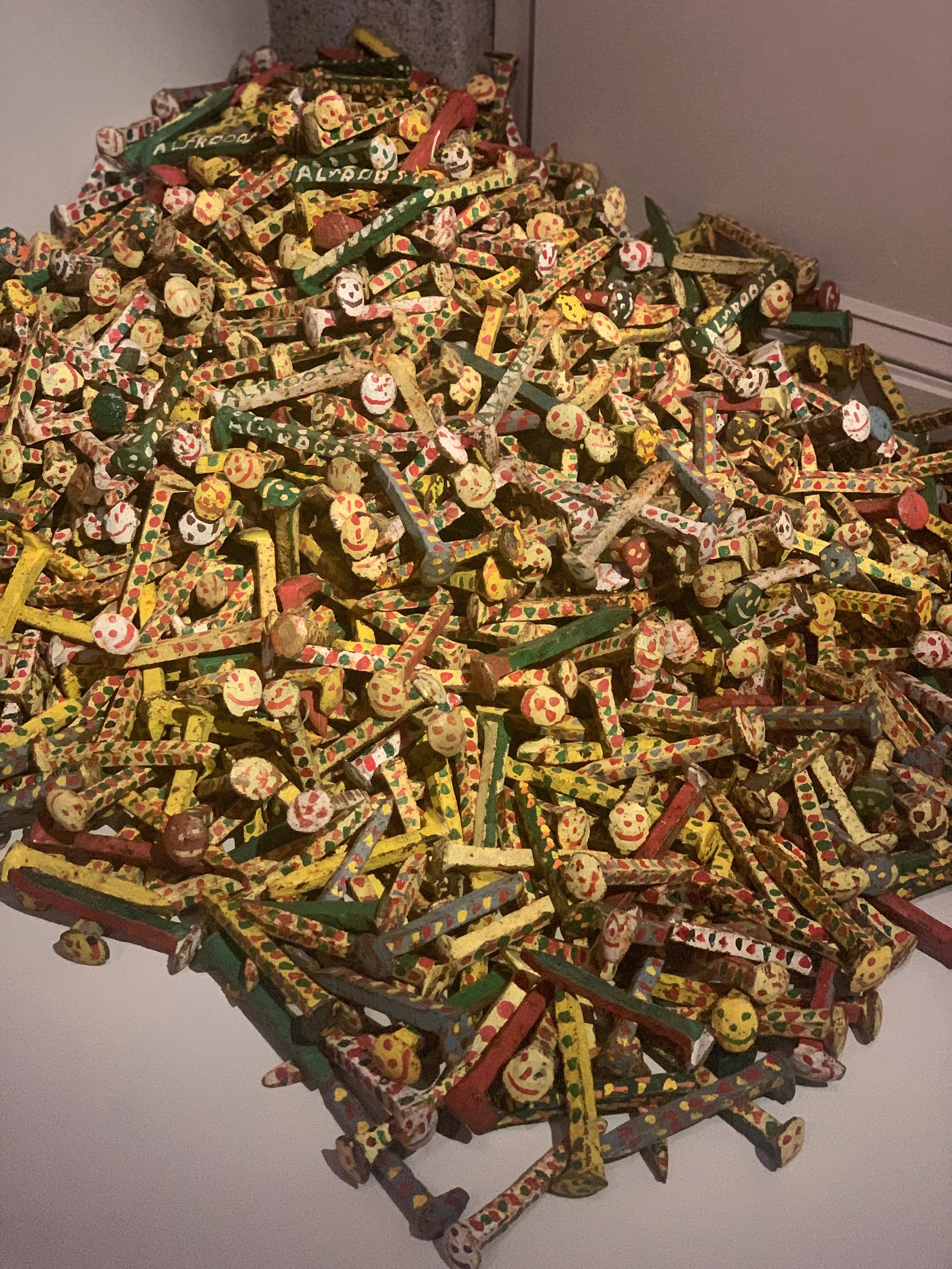 Doug: It's not numbered. I don't remember the year exactly. The last I’ll mention that I donated are the Albert “Kid” Mertz railroad spikes – just a giant pile of railroad spikes that the Michigan-based artist painted with little faces. There was just something so folky, carnival-like and joyous in them. They would sit in a pile in my mother's house and kids would come over and they'd pick them up and they'd want to play with them. They were a total magnet. It always got a reaction out of people, and it was very whimsical in a way that I think my mother appreciated.