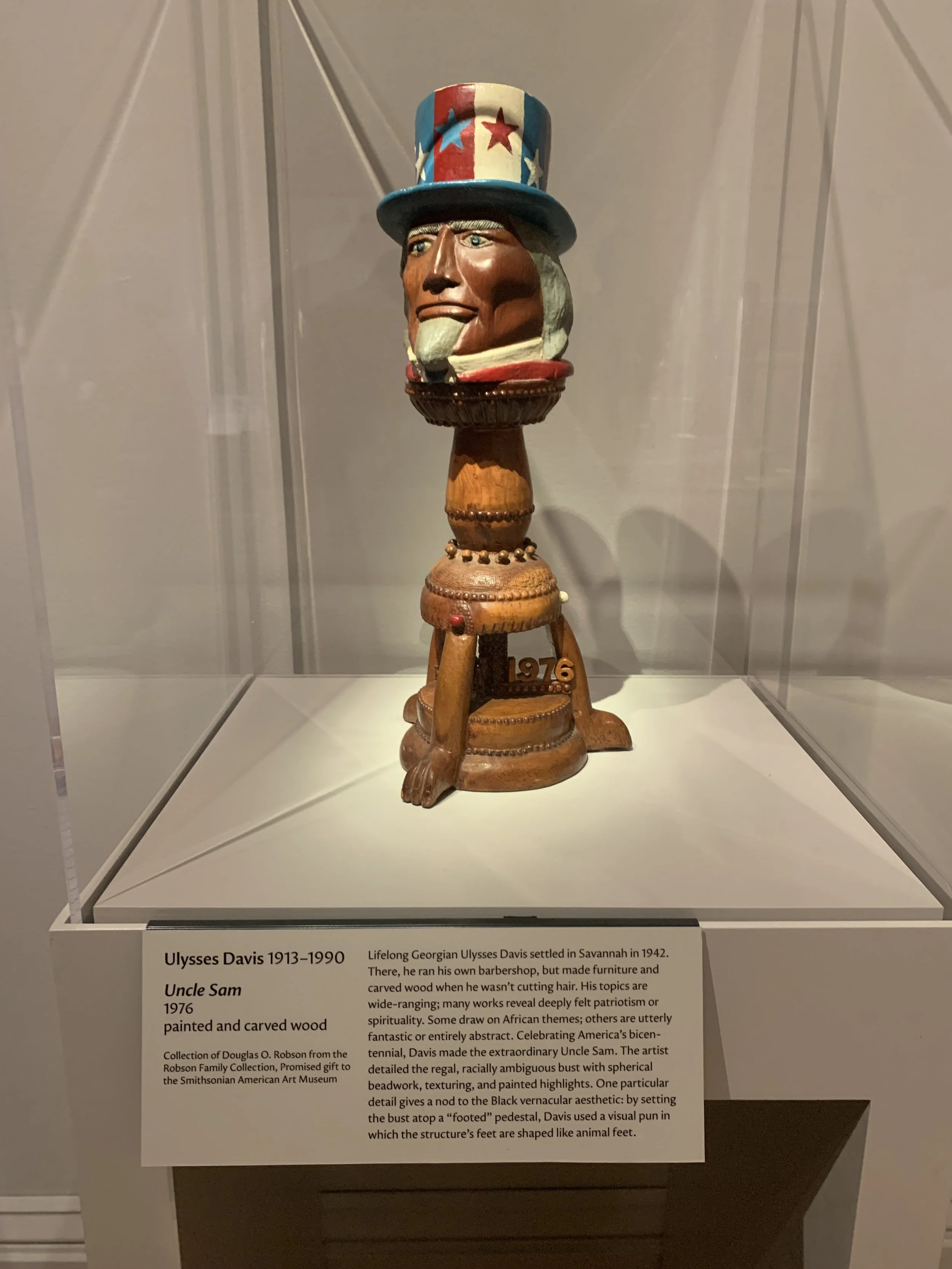 Doug: Well, everything that was in the exhibition will eventually go there as promised gifts, but there were pieces that came back to live with me for now. I mean, there were a couple of things my mother gave me before, and there are a couple of things that I doubt I will give to the museum before I'm gone from this world. What sticks out? Certainly, the Ulysses Davis ‘Uncle Sam’ is a piece that was in the show and lives with me now. And I don't expect it will be anywhere but with me until I'm gone… It's such a beautiful work. It speaks to Davis' patriotism and his pride at being American, but it also references his pride in being African American because the figure is very dark, it doesn't look like what we see in the normal Uncle Sam depictions.