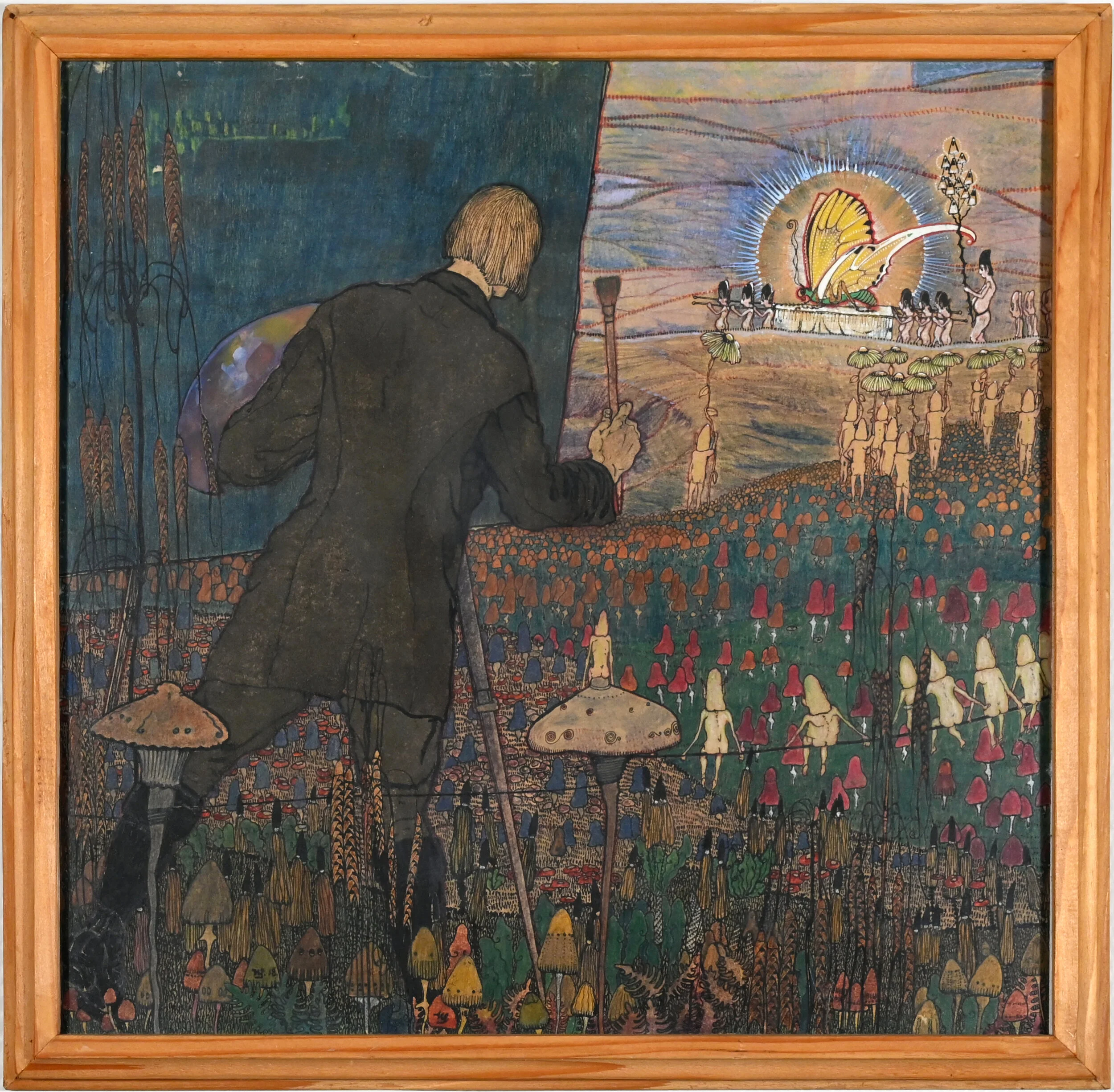Werner Schön work from 1918. It depicts himself in his visionary wonderland, with the ‘mushroom folks’. It’s gouache on paper.