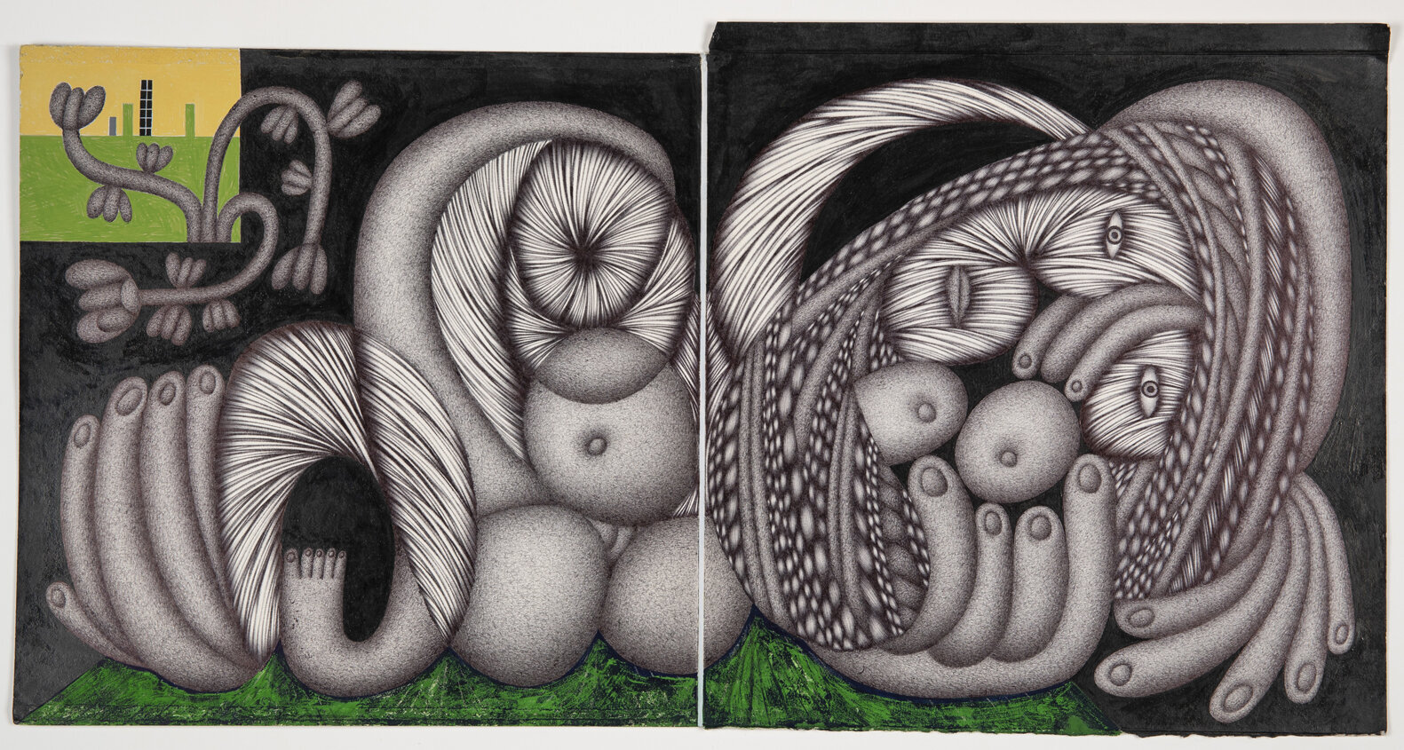 The colour has changed. I always had a limited colour palette in the past, which I did purposely to have a specific balance in the pieces and not have too much going on. But I was so distraught when this thing started to happen. I had a hard time concentrating and it was so surreal, so I told myself I am not going to adhere to any rules at all. My process is one of no preconceived ideas, but I usually make a lot of edits and changes. But I told myself with this new series, I was just going to sit down and make minimal changes to the basic shapes and not think about colour and just have it as a natural reaction. I decided with these that I was not going to think or have any rules anymore and that’s just kind of what I did.