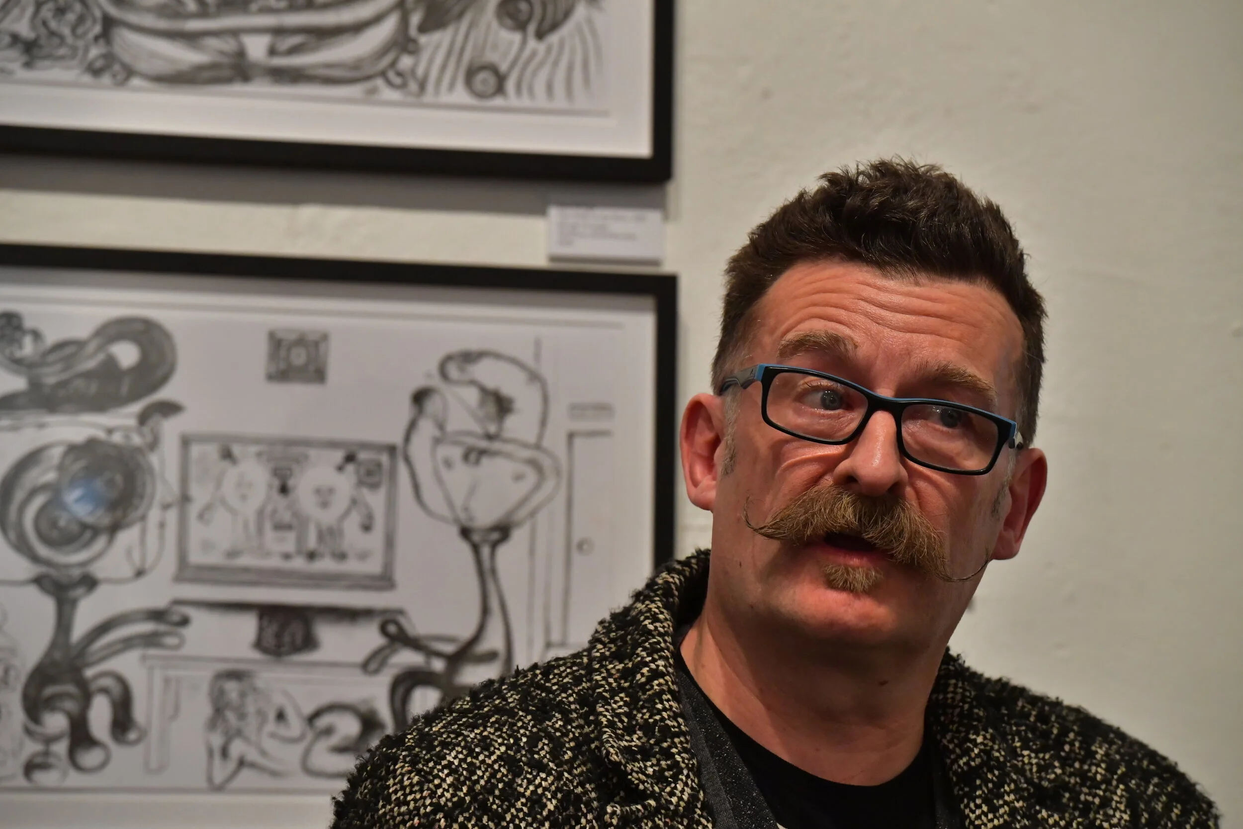 Terence Wilde talking at the Monochromatic Minds exhibition.