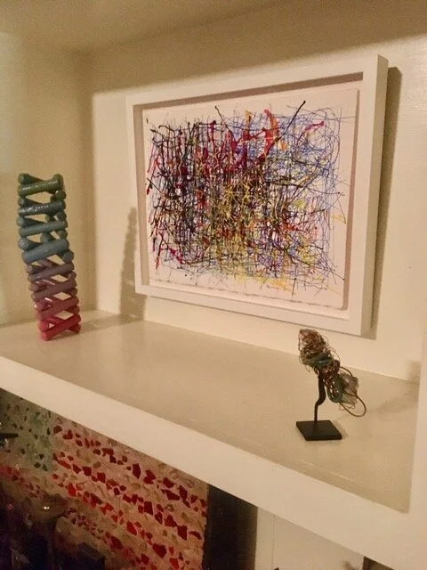Jay: I think for me it's the mix. One of the qualities, I think, of outsider or self-taught art is that it's not bound by a medium or a style, that it can be almost anything. I find increasingly that I'm not limited by specific qualities of style or form. But, as I thought about this question, one of the things that I've become aware of is how our collecting has changed over the years. I've become increasingly interested in art and artists that have a visionary experience, as part of their creative work and lives. And so artists, for whom abstraction may be part of that visionary experience, are increasingly interesting to me. An artist like Eugene von Bruenchenhein comes to mind as an example of that. And then as we were talking about earlier, I've become increasingly interested in artists whose lives have different developomental qualities such as the neurodivergent or neuroatypical, whose work then also often has a level of abstraction and non-representation to it, artists like Judith Scott and Dan Miller. One artist in particular interest is Karen May, who creates at NIAD Art Center. She is an artist who I like a great deal and I have collected. This led to my curating an exhibition for NIAD. My early connections with collectors and galleries focused on Southern artists like Howard Finster, Mary T Smith and Jim Sudduth. Our early collecting involved driving trips through the south to visit artists and collect. All those works still live with us., sharing space with the new.