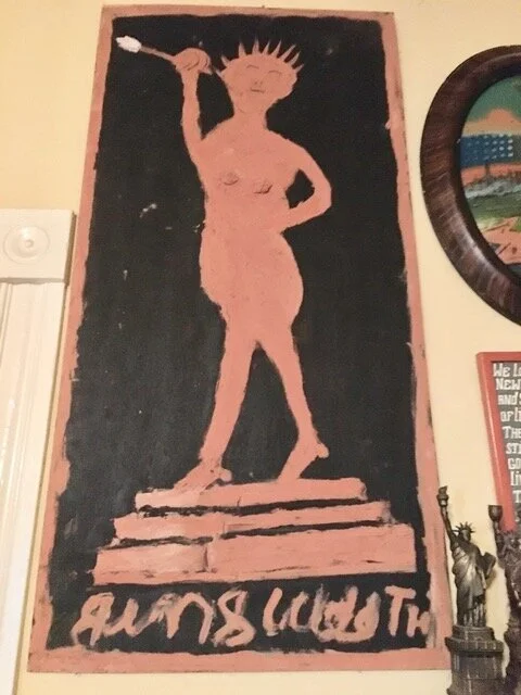 Jay: Wow, let me think. Each had experiences that were pretty remarkable. I remember we were going to Alabama to visit Jim Sudduth. And I had seen one of Jim's Statue of Liberty paintings, and had at the time a small collection of Statue of Liberty souvenir buildings. Before visiting Jim, I had this fantasy that he would have a Statue of Liberty painting that I might be able to get. And so we had a day long visit with Jim where he told stories, we sang songs and played guitar and harmonica and went out to lunch. When it came time to leave, Jim encouraged us to go around the house and pick out paintings that we might want. I didn't see a Statue of Liberty, so I asked him about it and he said “oh there's one behind that door over there”. So I pulled open the door and behind it was a half finished Statue of Liberty. He said “bring it on over here and we'll finish it”. So he laid the Statue of Liberty on my lap, it's a six foot long painting, and for another two hours we talked, while Jim finished painting with his cans of mud, talking the whole time about many things. We took the painting away, wet with mud. And I thought, what a incredible experience this was and that it would never be repeated.