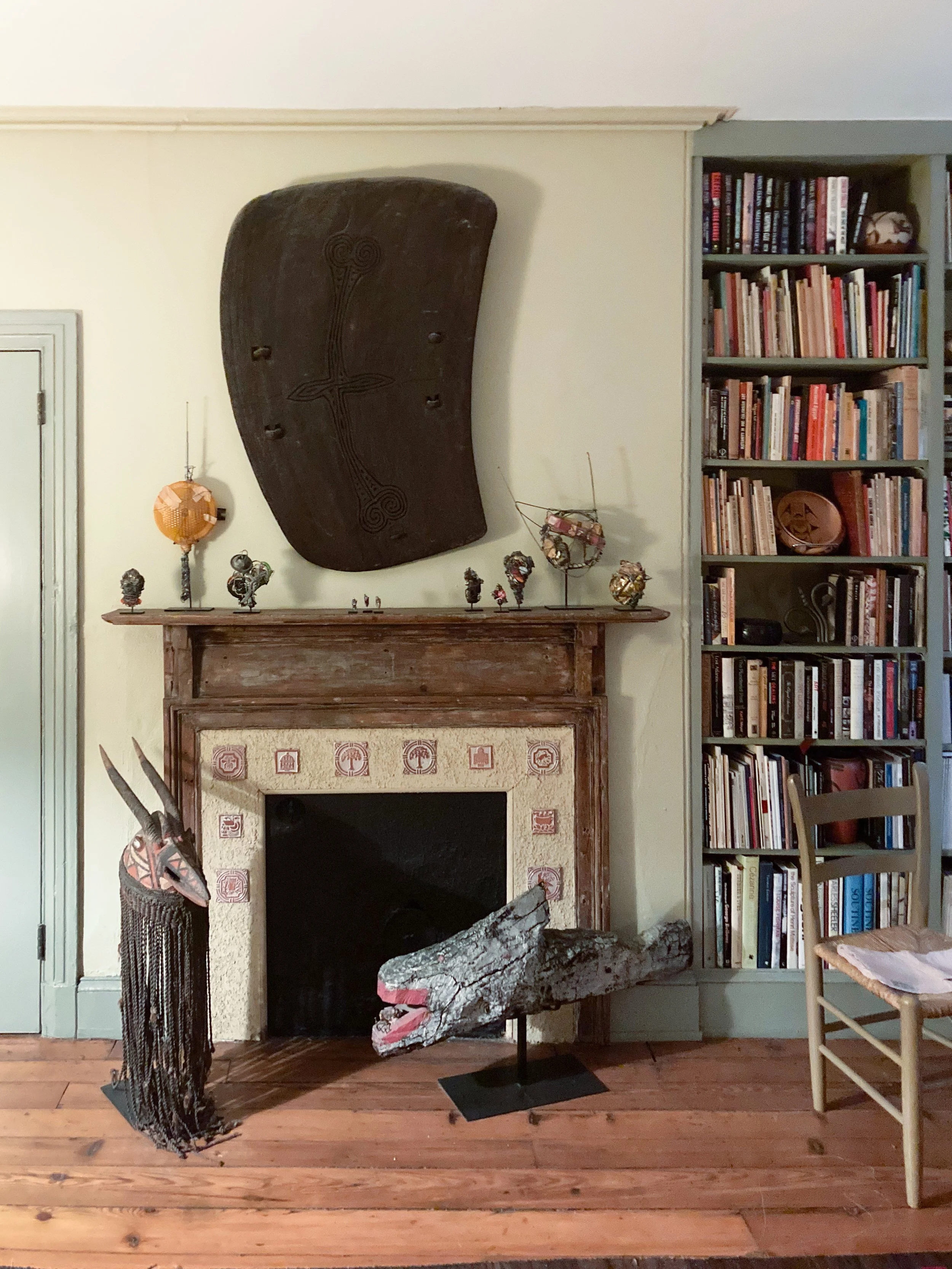 Mantelpiece has Philadelphia Wireman works. Above the mantelpiece the shield is a Lumi War Shield from New Guinea. The sculpture with the fibre is African Bobo Culture and large silver fish is by Sam Doyle. The pottery in the bookcase is Indigenous American Pueblo Cultures.