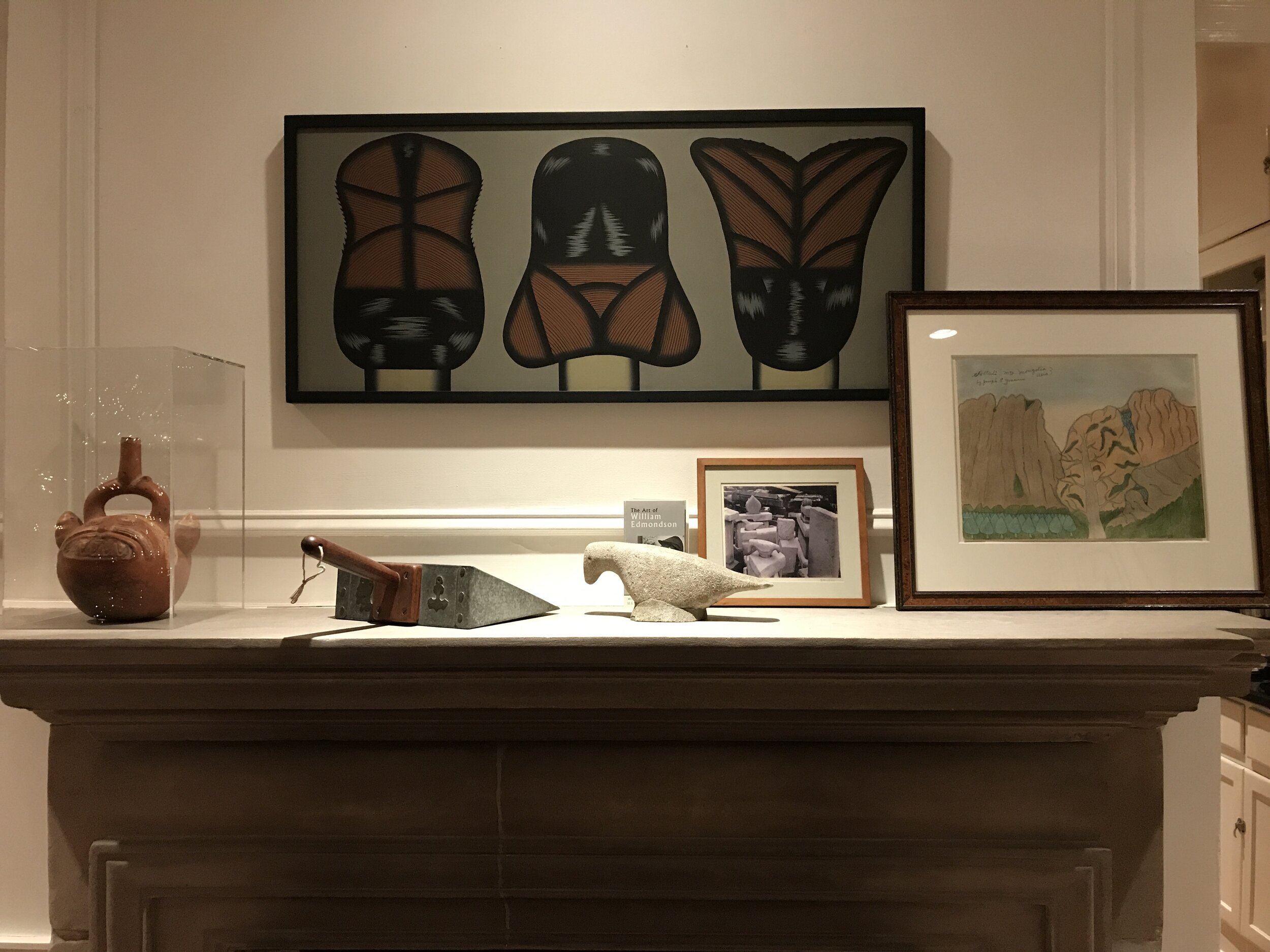 Installation shot L-R: Peruvian Pot, H.C.W. dustpan sculpture, Ramberg ptg, Edmondson Dove sculpture and Yoakum drawing