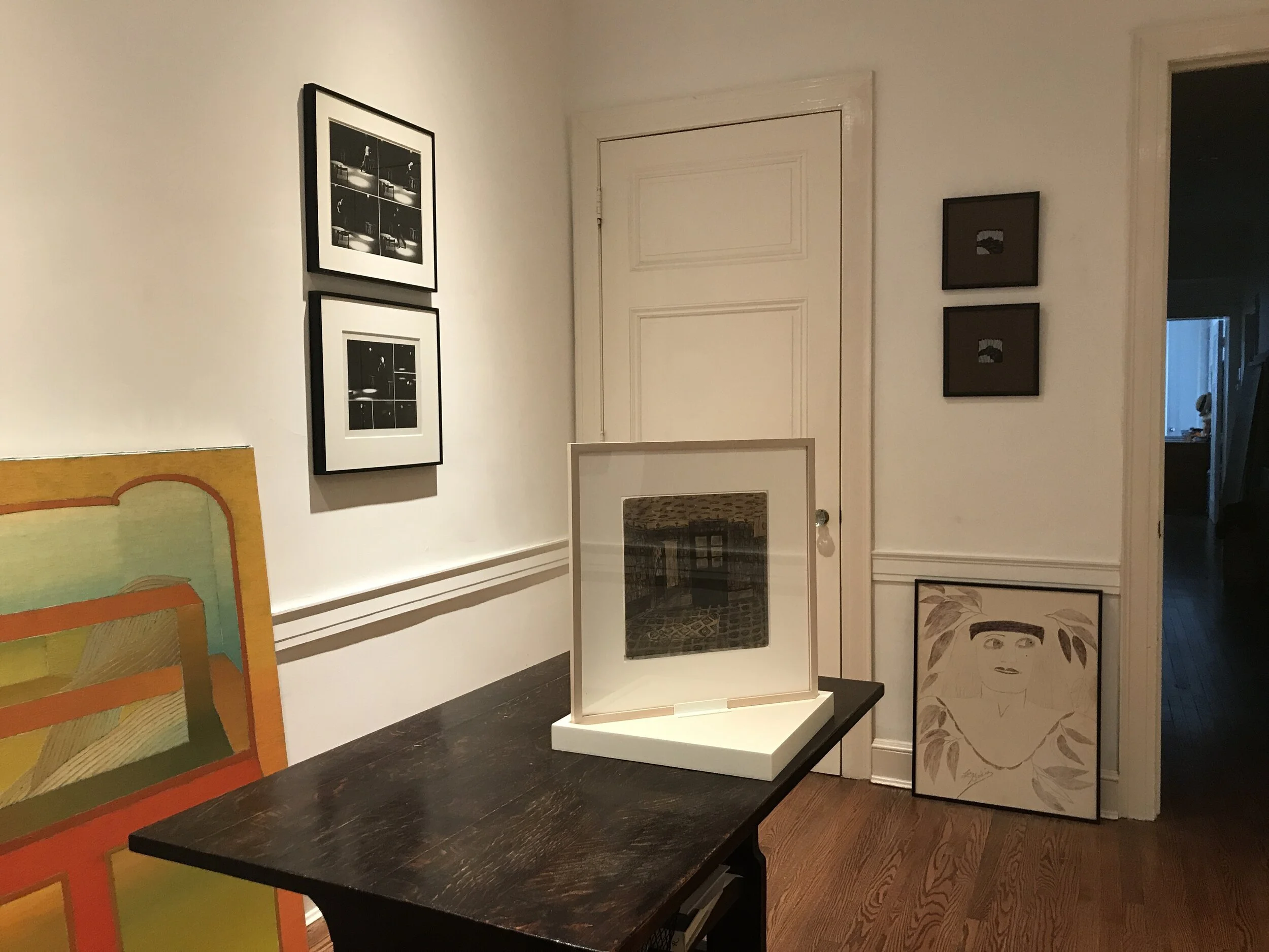 Installation shot L-R: Miyoko Ito Painting, Vito Acconci Photographs, James Castle Double sided soot drawing (on Stickley Table), Ramberg Hair Candy paintings, Lee Godie ball point pen drawing (floor)