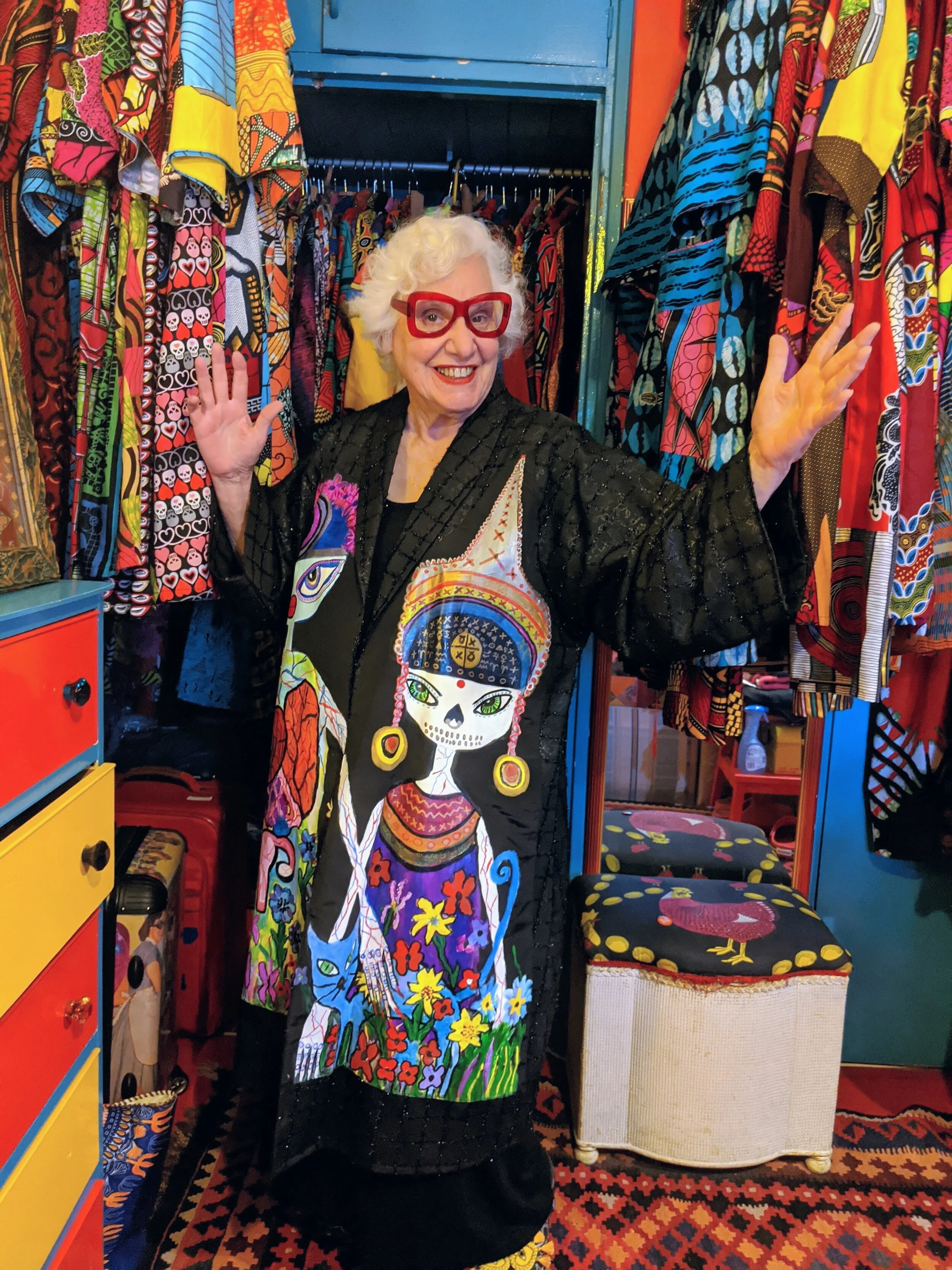 Sue wearing a piece painted by Angela Rogers