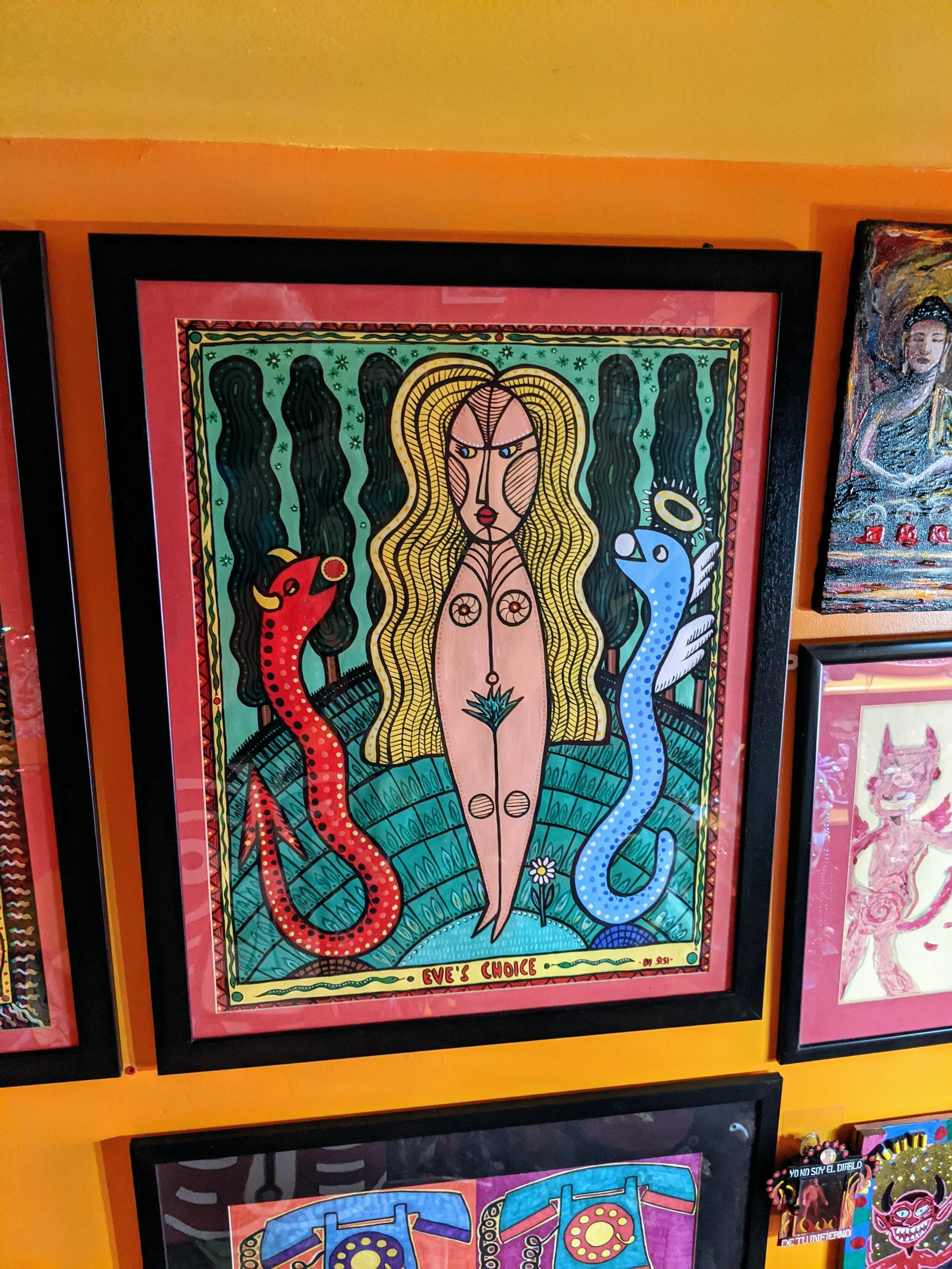 In time, a woman named Judith Alexander discovered Nellie. She had a gallery and curated a show for Nellie. I went to that show and I bought a drawing. A treasured part of our collection to this day (as can be seen in the photograph). Nellie took my son Shawm to one side and told him how to grow up to be a good person – he was around 4 at the time.