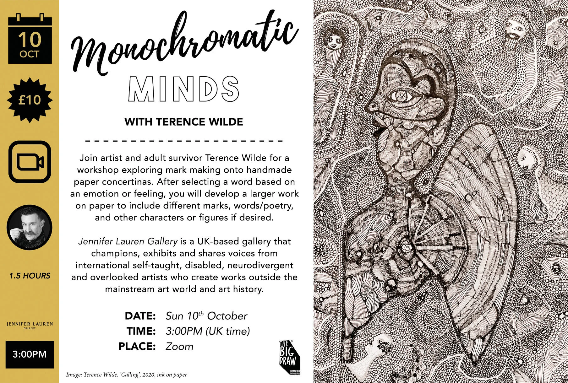 Join artist Terence Wilde for a 1.5-hour black and white workshop exploring mark making onto handmade paper concertinas. After selecting a word based on an emotion or feeling, you will then begin to use your new techniques learnt, to develop a larger work on paper to include different marks, words/poetry, and other characters or figures if desired. Be inspired byTerence’s autobiographical works and see where your mind takes you during this workshop! BOOK HERE (places are limited)