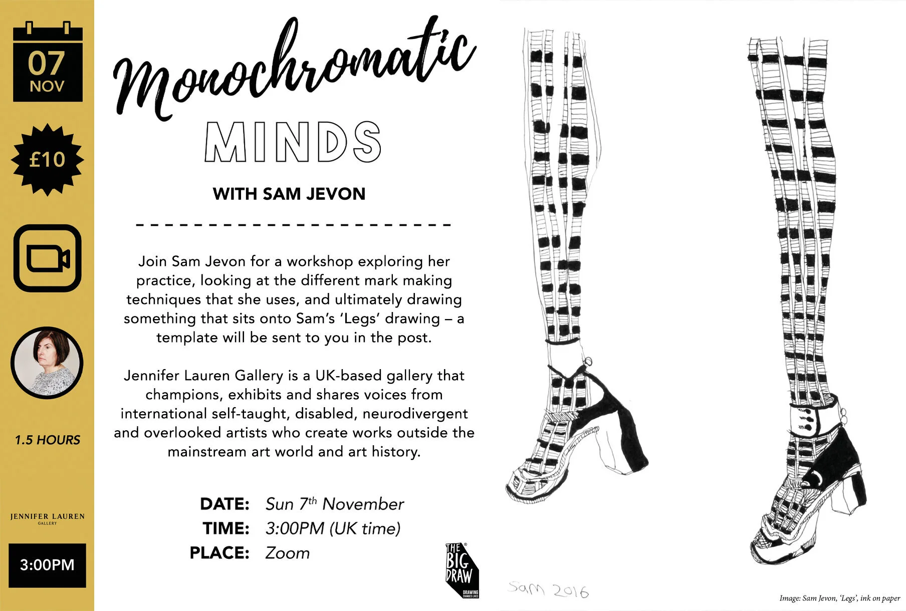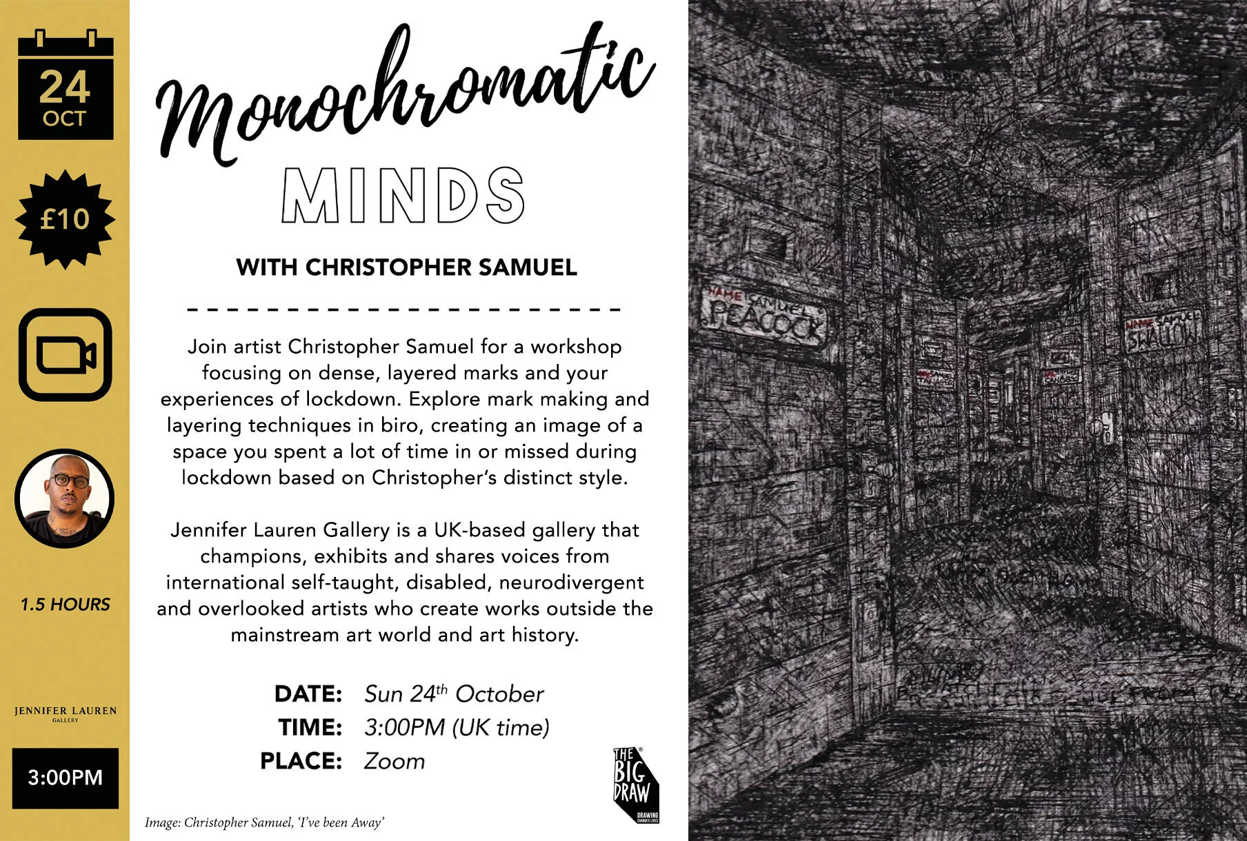 The Jennifer Lauren Gallery is thrilled to be partnering with The Big Draw for a series of three workshops linked to their Monochromatic Minds exhibition from 2020. Since then, the below three artists have been trained by the Gallery and Lucy Ribeiro, to run workshops both online and in-person. Each one-off workshop looks at the artists unique style or that of another artist that they liked from the exhibition. Please support the artists, book onto the workshops (through eventbrite) and learn new skills and about artists you may know nothing about. All workshops will be held with limited numbers over zoom. The workshop fee will be split between the artist and The Big Draw charity.