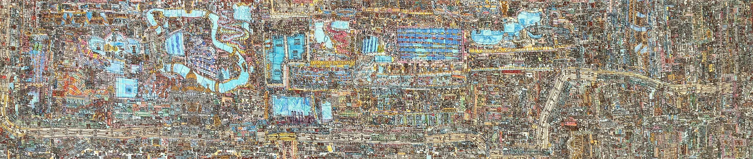 Kokubo draws freely on several pieces at once, that often contain: cities and buildings, satellites and cars, airplanes and ships... all themes from his childhood or from photos he has taken on trips. Next to a traditional Japanese castle we see Islamic or European architecture, or gleaming skyscrapers of the future. His complete disregard for traditional perspectives invites us into an entirely new world and a new sensation. Throughout the day he draws: in the morning, during breaks at his institution, and then at home.