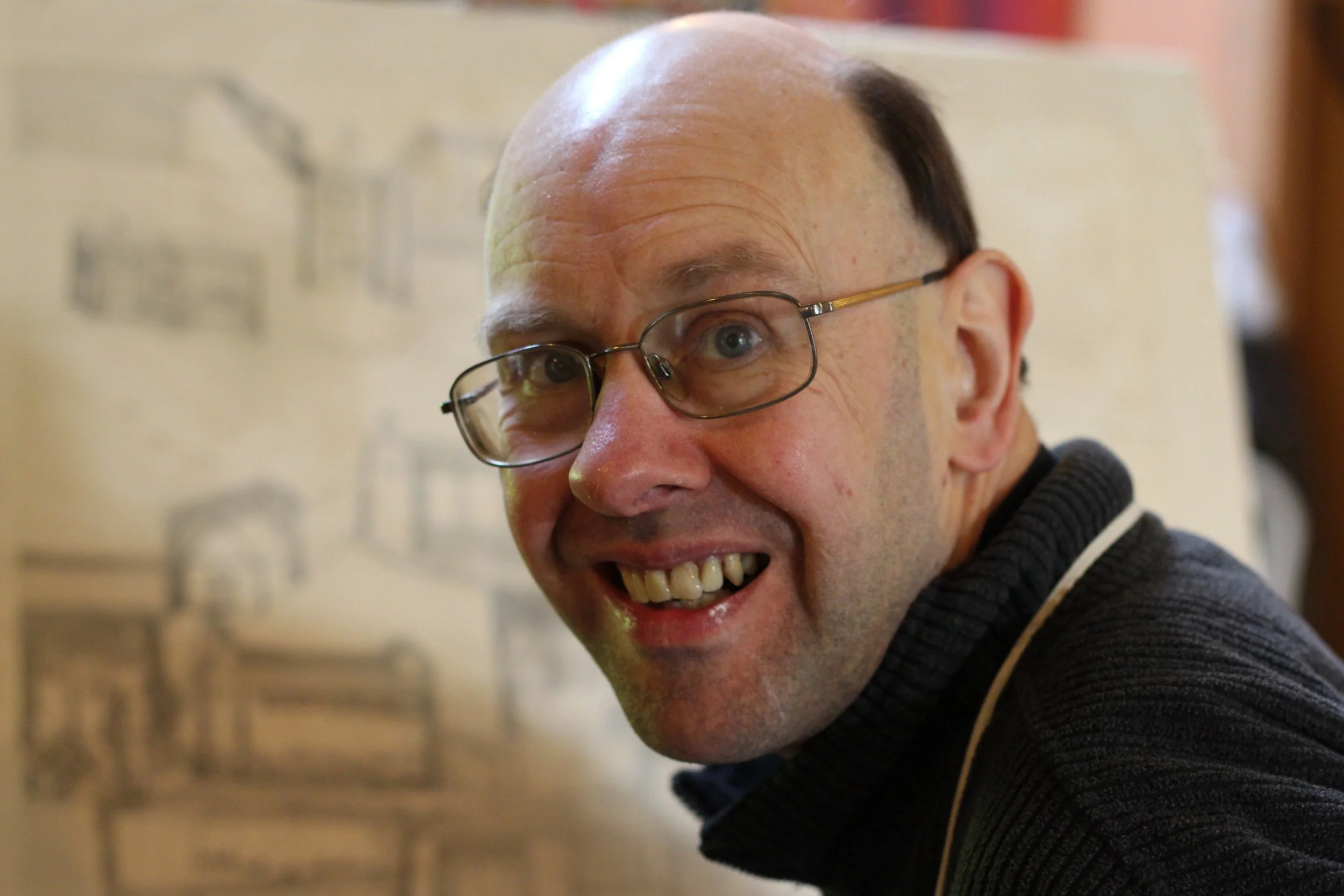 I would like you to join me in a celebration of the work of Robin Wise who sadly passed away in 2021 aged just 59. Although originally from Stirling, Robin Wise had resided in Aberdeen since 1991. He was a quiet and gentle self-taught artist, who was recognised as being on the Autistic Spectrum shortly after his birth in 1961. He was particularly thankful to those around him at Newton Dee – a community based on the outskirts of Aberdeen, that supports learning disabled adults to live, as well as find meaningful work and learn new skills, – who gave him the space and support to develop his skills and his own individual style. Robin particularly liked working in the bakery on site, and many of his drawings depict his life in this unique community.