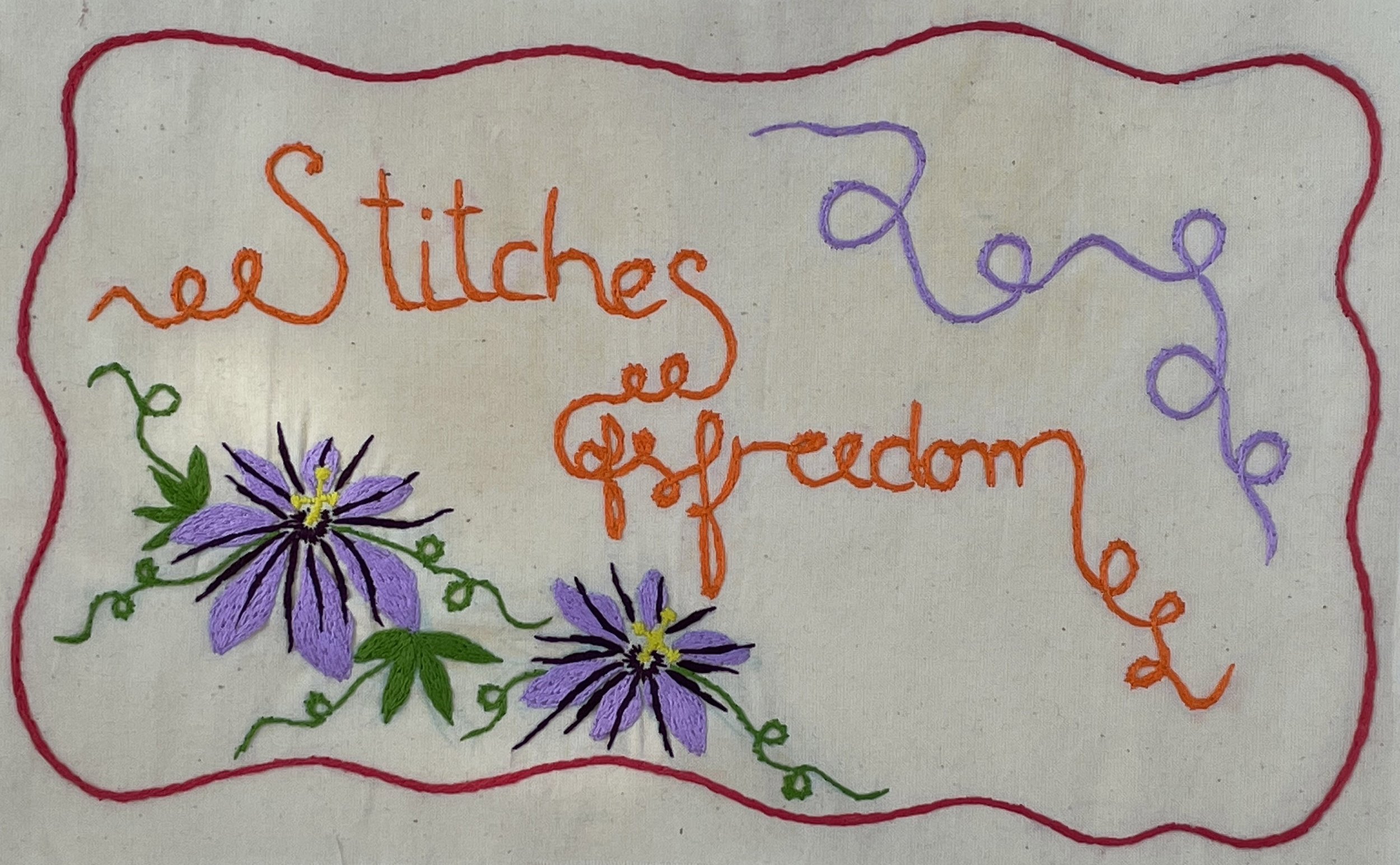 Join Alice Kettle and me in a celebration of the work of two refugees that Alice met whilst working on Thread Bearing Witness in 2018 – Monica Hamakami and Susan Kamara. Since that time, Alice has stayed in touch and continued collaboration and support for these two artists, helping them to realise their talents and giving them an outlet for their emotions and life stories. Stitches of Freedom showcases newer and older works, alongside two new collaborative works made specially for this online presentation. Both artists will join Alice and Jennifer for an online talk, as well as an online textile workshop – see below for details on these. Below, Alice shares a little more about her relationship with the artists and her wish to have a legacy for the artists beyond the Thread Bearing Witness project. Enjoy looking at this online presentation.